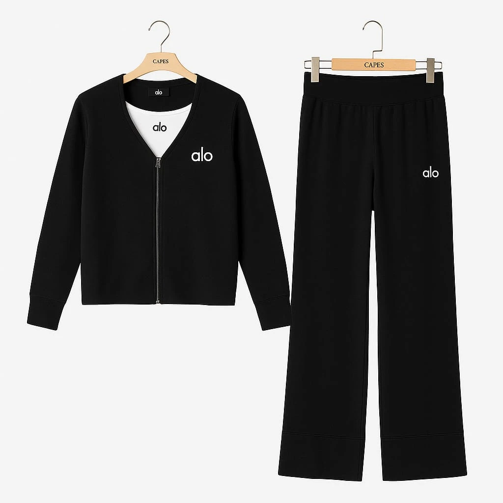 يتكوّن من جاكيت بسحاب أمامي بتصميم بسيط يحمل شعار alo عند الصدر، وبنطال واسع الساق بنفس اللون والخامة مع شعار مماثل لإطلالة متناسقة وعصرية.