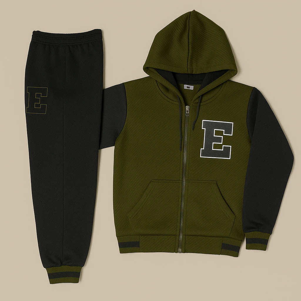 طقم ولادي أنيق يجمع بين اللون الزيتي والأسود، مزين بحرف E كبير على الصدر والبنطال لمظهر شبابي بسيط.