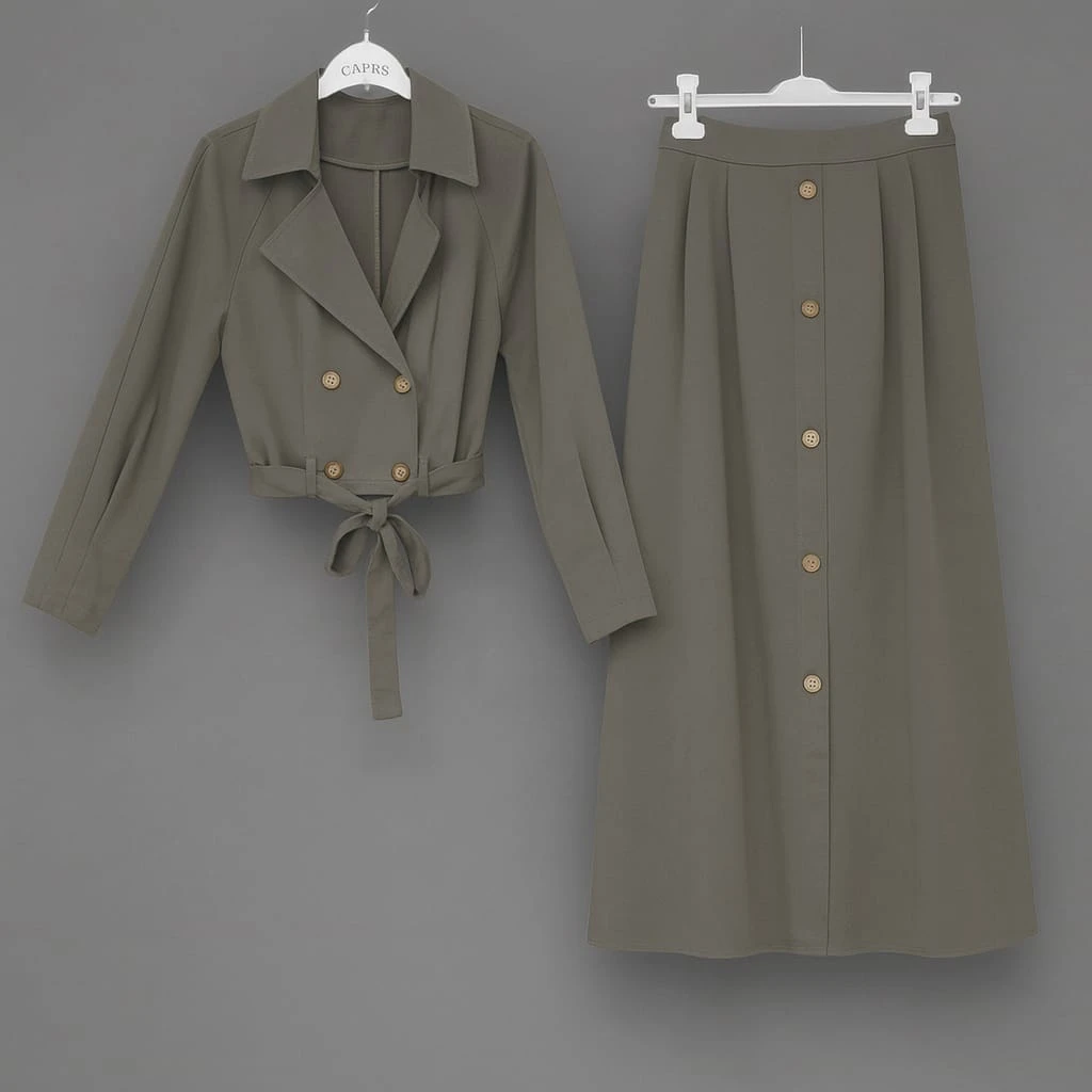 طقم أنيق من قطعتين باللون الزيتي، جاكيت قصير مزوّد بحزام خصر وتنورة طويلة بأزرار أمامية تضيف لمسة كلاسيكية راقية. تصميم متناسق يناسب الإطلالات الهادئة والمناسبات اليومية بأناقة عصري