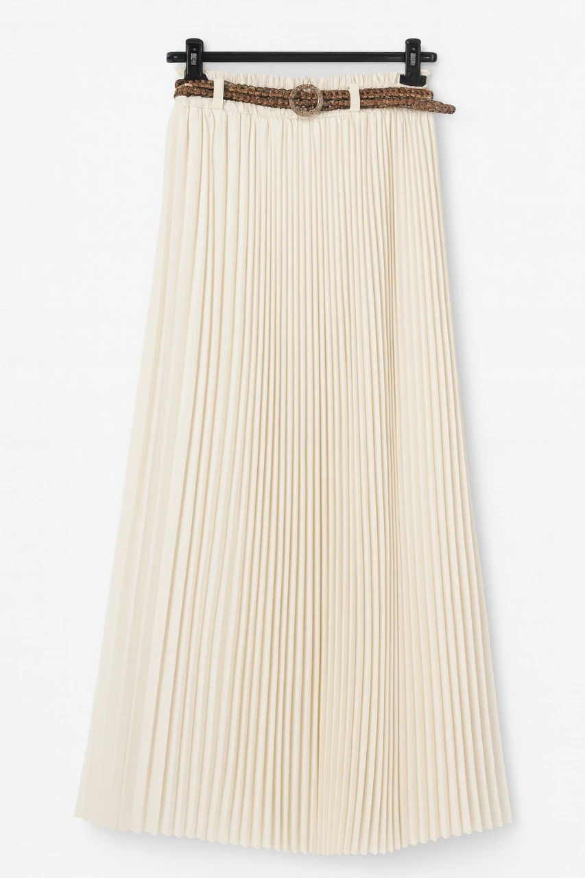 تنورة نسائية بليسيه أنيقة بلون أوف وايت، بتصميم كسرات ناعمة تضفي انسيابية ورُقي على الإطلالة. مزودة بحزام بني منسوج بتفاصيل أنيقة ولمسة طبيعية، مع خصر مطاطي مريح يناسب مختلف المقاسات، لتمنحك مظهرًا أنثويًا عصريًا ومريحًا.