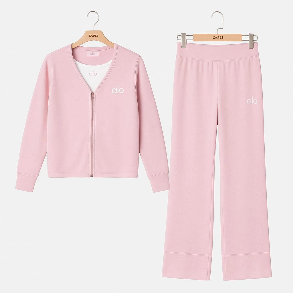 يأتي باللون الوردي الفاتح لإطلالة أنثوية ناعمة وعصرية، ويتكوّن من جاكيت بسحاب أمامي وشعار alo مطرز على الصدر، مع بنطال بقصّة مريحة وخصر مطاطي يحمل الشعار نفسه لمظهر متناسق.